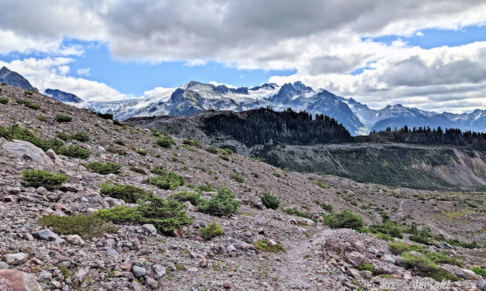 オパールコーンの分岐点を通過すると一本の細いトレイルとマムクアム氷原(ウィキペディアも Glacier ではなく Icefied を使用)が見え、そちら方向に進みます。約180°後ろにはガルバルディ山やガルバルディ氷河が見えます。