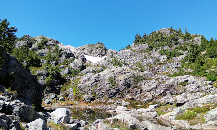 写真を撮っている右側の岩山とポンプピークがある左側の岩山との間にはV字谷があり、雪又は雪解け水溜まりなどがあります。雪でも歩くことができる場合もありまし、上のドライな岩場を歩くことも出来ます。