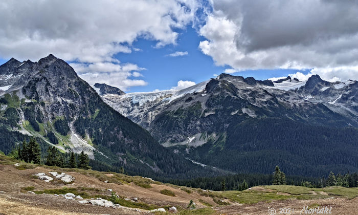 マムクアムレイクに下る途中からマムクアム氷原 Mamquam Icefiel とピラミッドマウンテンを見て下ります。ずっと誰にも人に会っていなくこの緑のある地域はクマのえさになるような植物もありそうです。